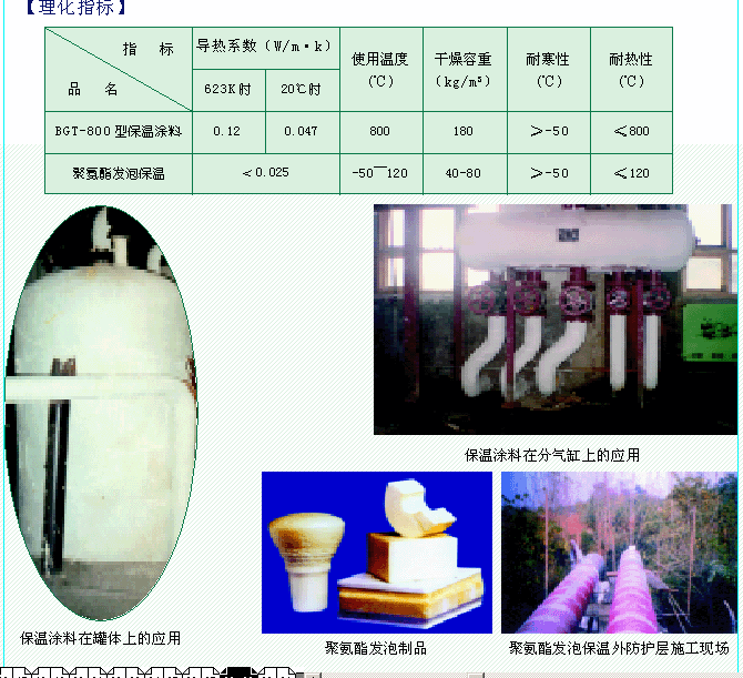 BGT-800型復合硅酸鎂保溫涂料是一種新型無機微孔網(wǎng)狀輕質(zhì)高效保溫材料,產(chǎn)品屬于不定型膏狀,施工方便、絕熱性能好、不開裂、不粉化、不脫落??蓮V泛應(yīng)用于化工、電力、冶金、石油等行業(yè)的高溫管道,尤其適用于異型熱力管網(wǎng)及閘、閥、球體的保溫隔熱。經(jīng)檢測,其各項性能指標均優(yōu)于其它傳統(tǒng)保溫材料。